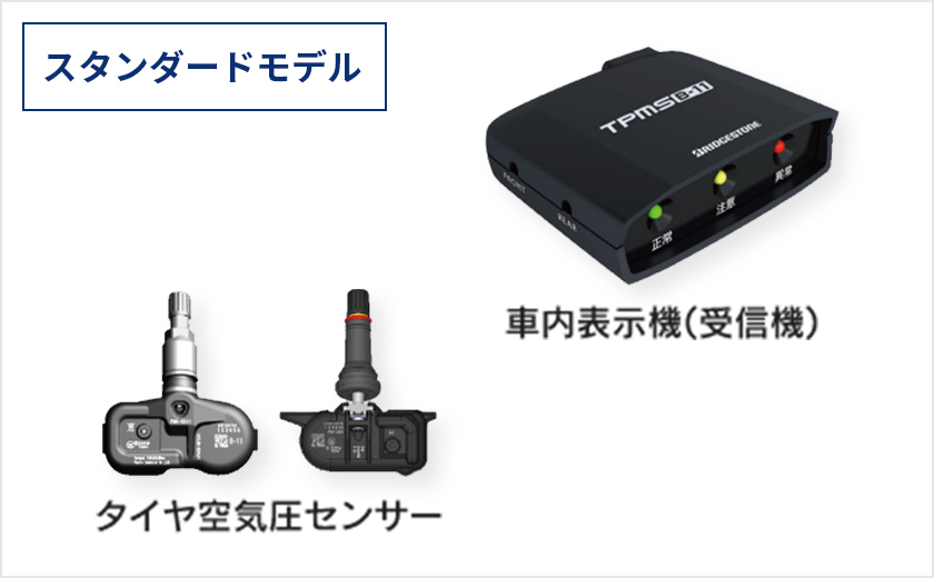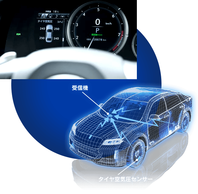 TPMSはタイヤ空気圧監視システム(Tire Pressure Monitoring System)の略称で、タイヤ空気圧センサーをタイヤに取り付け、低空気圧になった場合にドライバーに異常を知らせることができるシステムです。