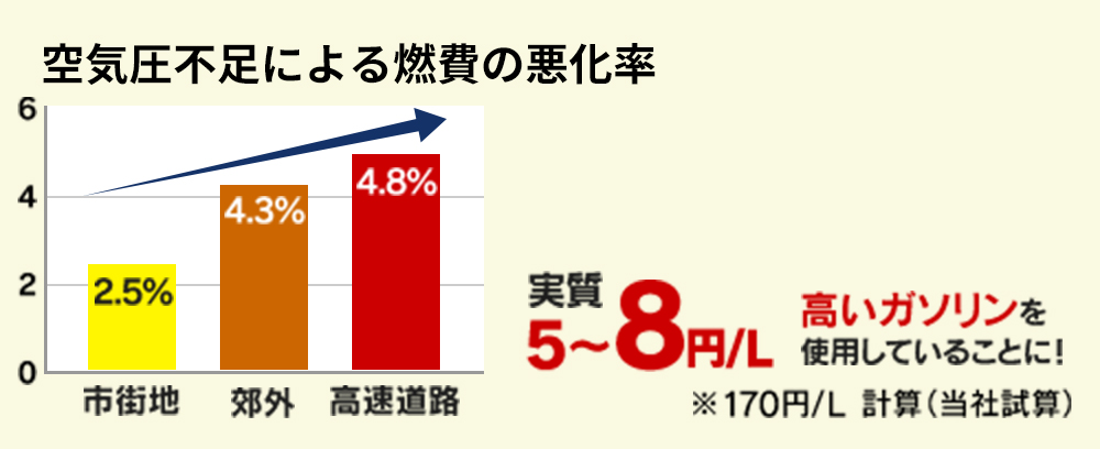 ※排気量2000ccの乗用車で空気圧50kPa不足の場合